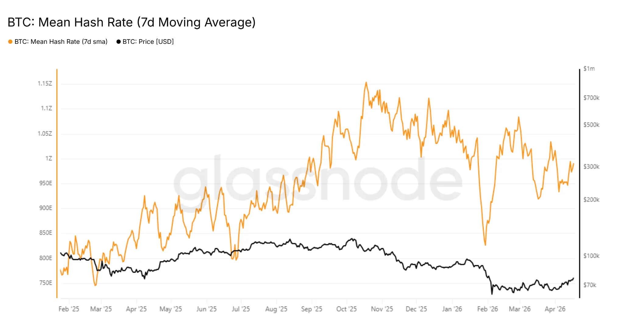 Согласно Glassnode, сглаженный 7-дневной скользящей средней показатель вычислительной мощности сети с начала месяца восстановился с ~978 EH/s до ~992 EH/s. С марта значение устойчиво находится ниже знакового уровня в 1 ZH/s.