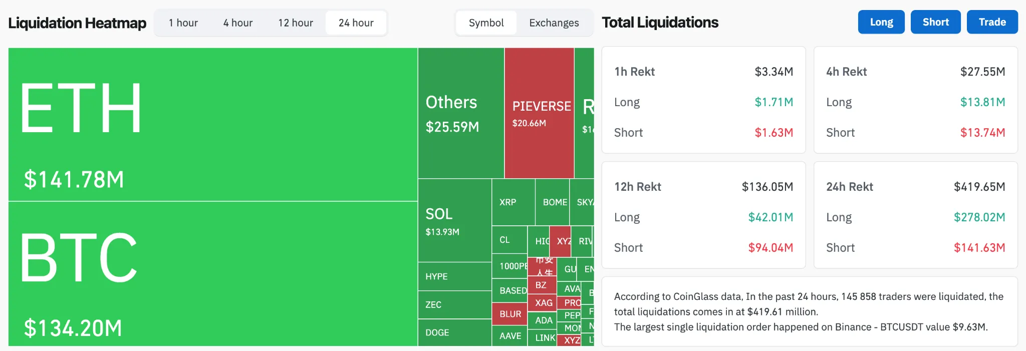 Объем ликвидаций на крипторынке достиг $419 млн за сутки. Большая часть — $218 млн — пришлась на длинные позиции.