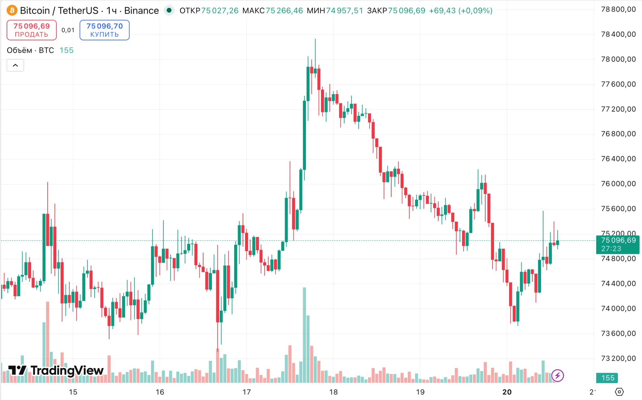 20 апреля курс первой криптовалюты держится около $75 000: -0,2% за день, но +6,3% за неделю. В выходные США захватили иранское судно, а Тегеран вернул контроль над Ормузским проливом.