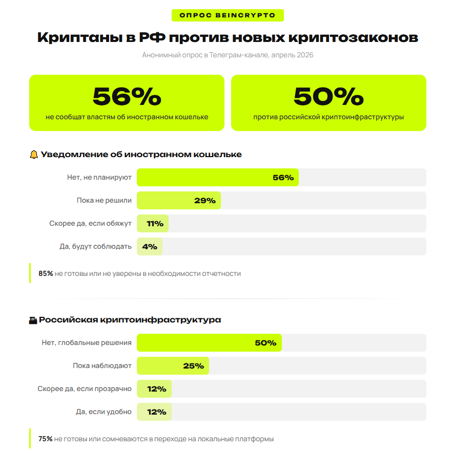 Опасения ассоциации подтверждаются настроениями самого криптосообщества. Редакция BeInCrypto провела два анонимных опроса в своем Телеграм-канале. Результаты показали, что 56% респондентов не намерены уведомлять власти об открытии иностранного криптокошелька, а еще 29% заняли выжидательную позицию. Готовность к отчетности в той или иной форме выразили лишь 15% участников.