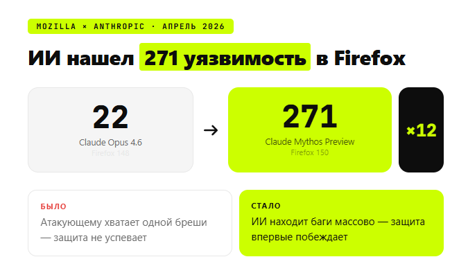 На этой неделе Mozilla выпустила Firefox 150 с патчами для 271 уязвимости, которые выявил ИИ Claude Mythos Preview от Anthropic в ходе первичной проверки безопасности.