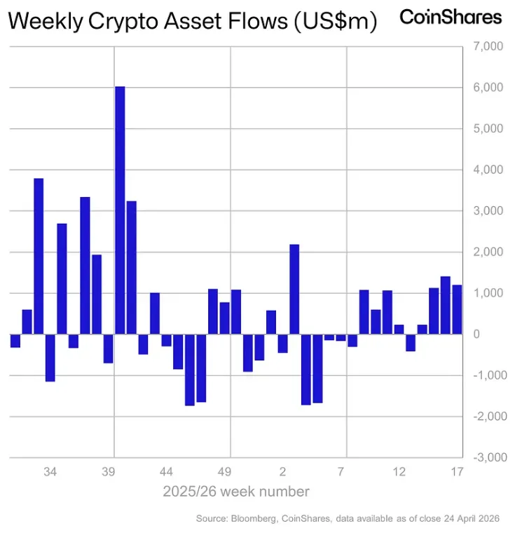 С 20 по 24 апреля поступления в инвестиционные продукты на базе цифровых активов составили $1,2 млрд. Положительная динамика сохраняется четвертую неделю подряд.