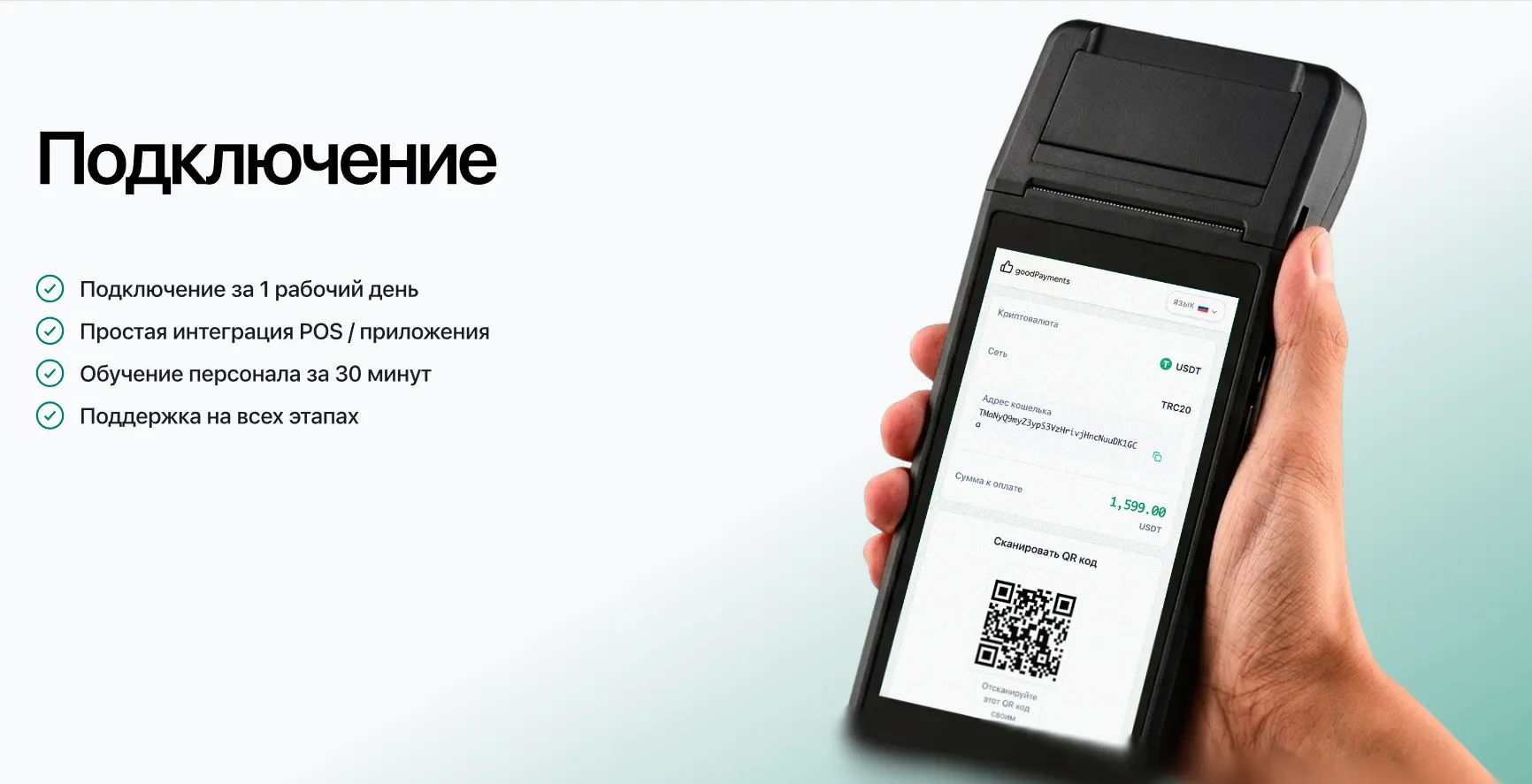 Кроме онлайн-процессинга, goodPayments развивает POS-решение для офлайн-точек. По описанию команды, кассир вводит сумму, POS генерирует QR-код, клиент оплачивает с любого совместимого кошелька, подтверждение приходит за 10–20 секунд.
