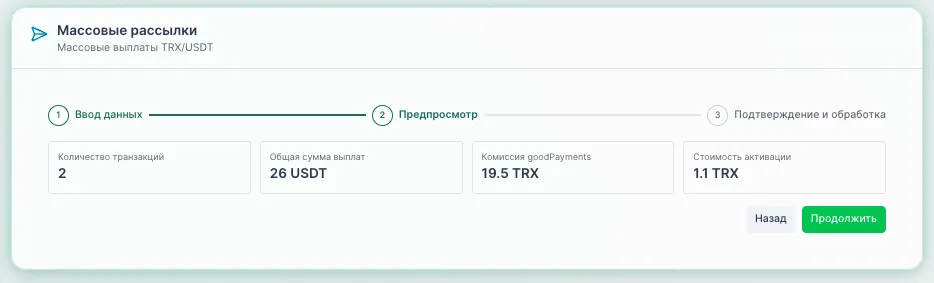 Массовые выплаты. Инструмент рассылает TRX или USDT (TRC-20) на сотни адресов одной операцией. Получателей можно добавить вручную или загрузить файлом в формате XLSX, CSV или TXT (до 5 МБ). Процесс проходит в три шага: