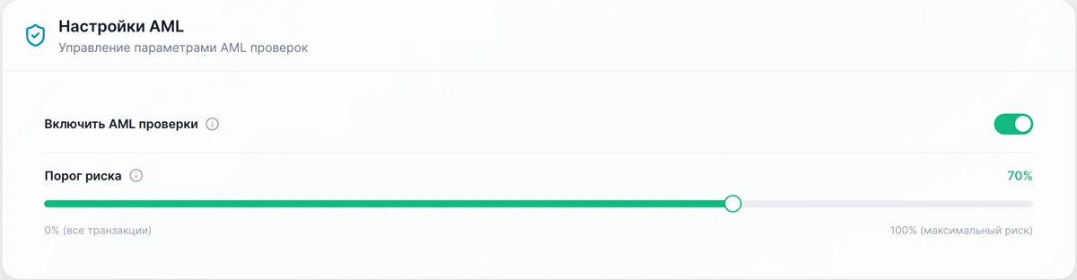 AML-модуль в goodPayments опциональный. При активации каждая входящая транзакция сверяется с установленным мерчантом порогом риска в диапазоне 0–100%. Если значение риска выше порога — средства возвращаются отправителю; если ниже — транзакция уходит на кошелек мерчанта.