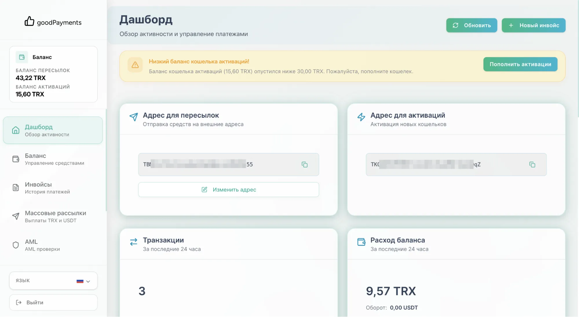 Какие комиссии берет goodPayments?Комиссия сервиса за пересылку средств на кошелек мерчанта: 6,5 TRX — если оплата в TRX или если на основном кошельке мерчанта уже есть USDT; 13 TRX — если оплата в USDT, а на основном кошельке мерчанта нет USDT. По курсу апреля 2026 года это $2,15 или $4,30 за транзакцию. Отдельно с баланса активаций списывается 1,1 TRX за активацию временного адреса при поступлении USDT. AML-проверка опциональная — $1 за адрес. Других сборов нет.