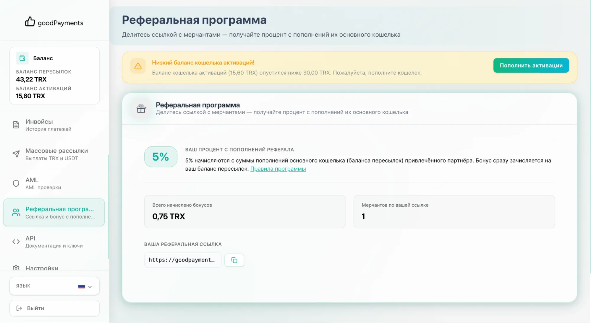 Реферальная программа. Каждому мерчанту в личном кабинете доступна персональная реферальная ссылка. Новый мерчант, зарегистрировавшийся по ней, автоматически закрепляется за реферером. Бонус — 5% с каждого пополнения основного кошелька (баланса пересылок) привлеченного партнера.