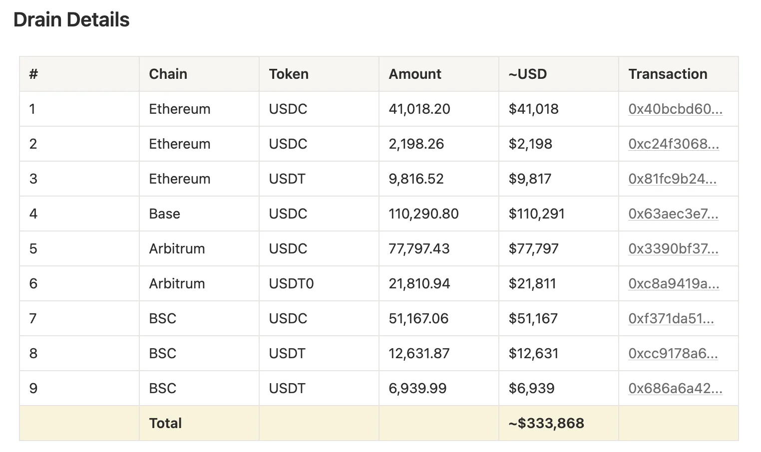 Пользователи не пострадали: эксплойт затронул только три внутренних кошелька разработчиков. Общий ущерб составил $333 868 (в основном USDC и USDT). Злоумышленник вывел средства через девять транзакций в Ethereum, Arbitrum, Base и BSC.